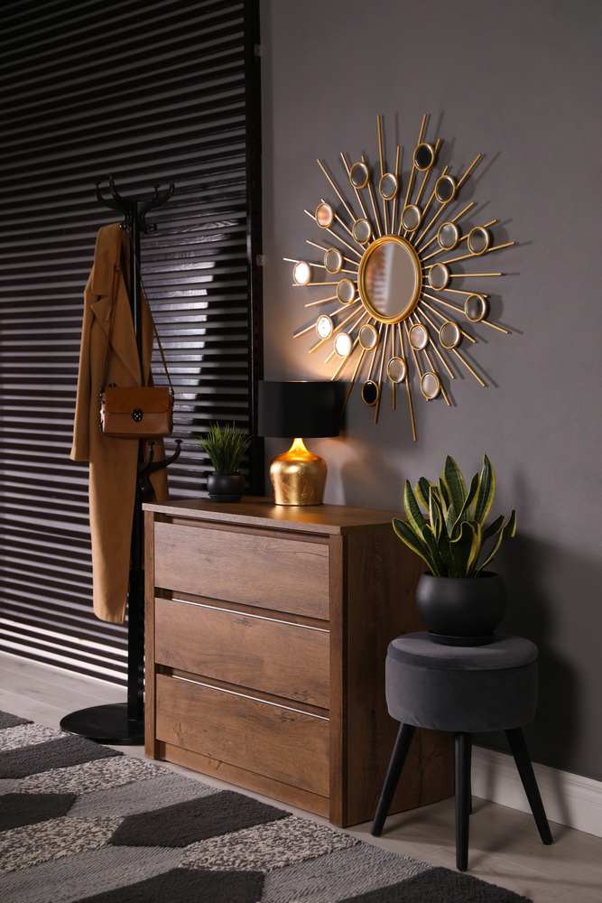 We’ve got one word for this picture: mood. Instead of picking light and bright colors, try out a richer, moodier color. Nothing will take your entryway to luxury faster than picking a darker color palette! We love the contrast of the gold lamp and sunburst mirror against the gray in this one.