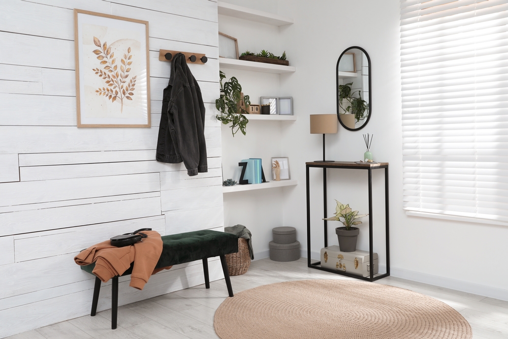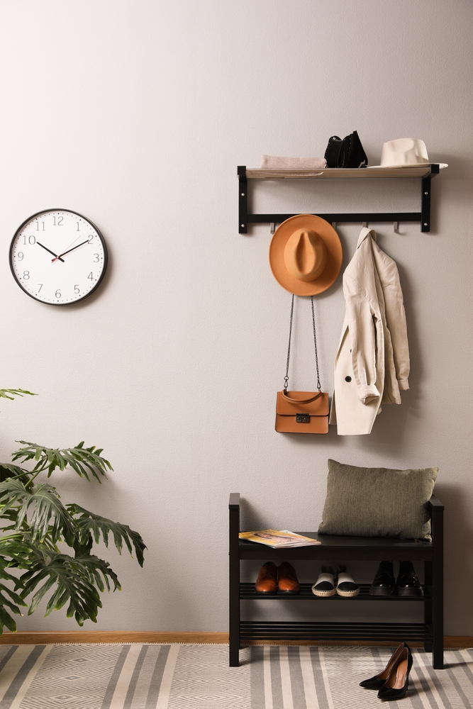 When your real estate is less of an estate and more of an apartment, you have to use every inch wisely! The bench and hook shelf combo serves the function of a hallway tree, but is a bit smaller and could be partially DIY-ed to save money. To get even more creative, this homeowner could replace the clock with a mirror and a floor lamp for more dimension and lighting.