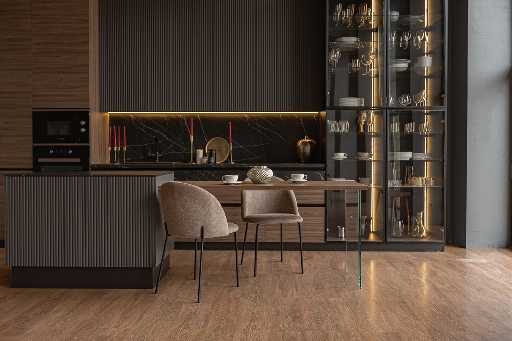 Dressed in sophistication, this kitchen features dark marble backsplashes, gorgeous wood accents, and thoughtfully styled glass floor-to-ceiling cabinets. This space deserves lighting that highlights every square inch. The under-cabinet lighting and strip lighting in the glass cabinets create a moody ambiance with dramatic shadows and highlights that will have guests’ jaws on the floor the minute they step into this kitchen.