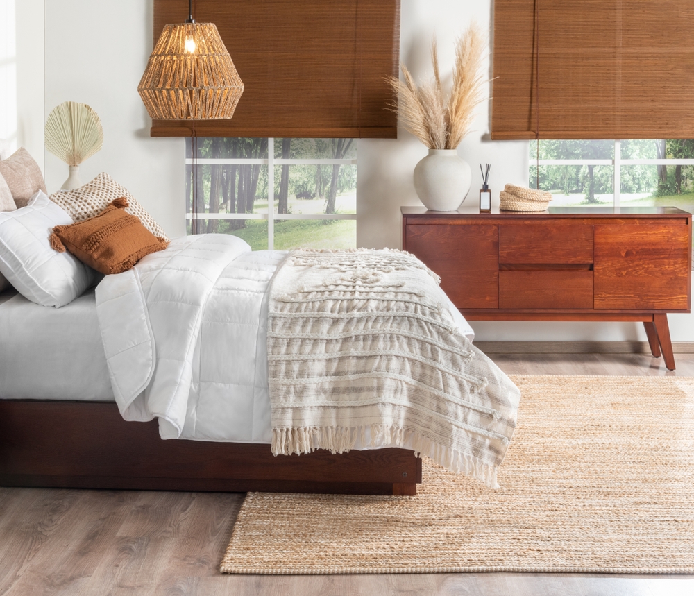 This boho-inspired bedroom leans into the organic modern trend with great use of warm tones and natural accessories; including a rattan pendant light hanging over a bed of simple cotton textiles, a textural jute rug, a display of dried grasses, and simple wooden roman shades. The decor pieces elevate this otherwise rather minimalist space.