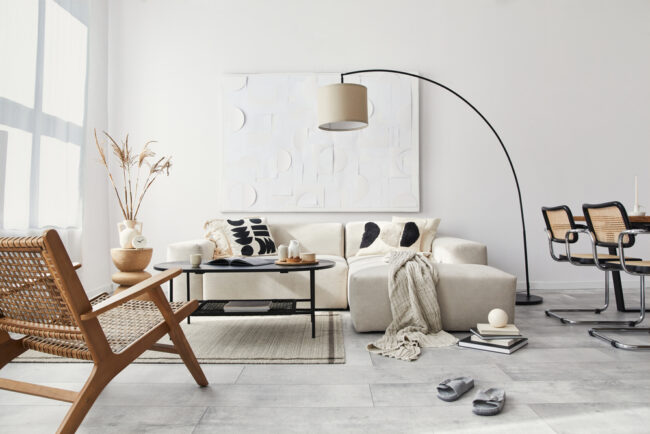 Another way to make your space look upscale is picking a more expensive light to be a focal point, while adding other less spendy lights to light up the room. The eye will be drawn to the focal point and won’t notice anything else! To start, install a chandelier to draw attention away from any existing recessed lights. Throw in a floor lamp where you need some extra lighting and–voilà! Your eye will be drawn to the chandelier, but the room will still be beautifully lit.
